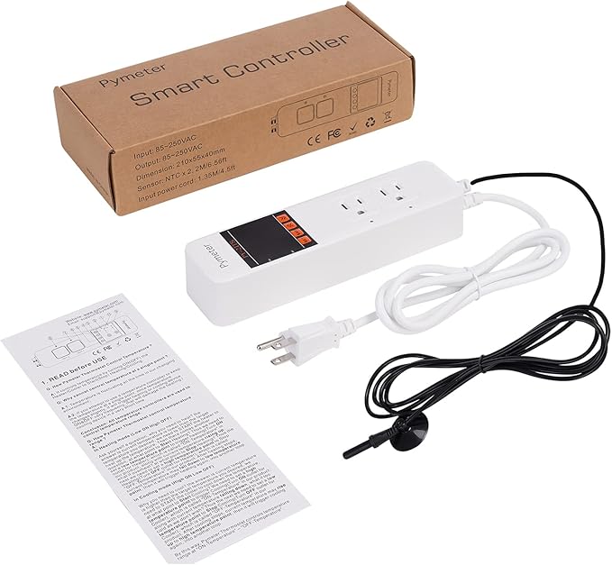 - Plug and Play: Pymeter temperature thermostat is incredibly easy to use,simply plug your heating/cooling device into the outlet, place the probe in the area you want to control, the large digital display supports both Fahrenheit and Celsius, and the upper display shows the current temperature while the lower display shows the control mode. With a maximum of 1200W/10A per outlet and a temperature range of -40-210℉/-40-99℃ with 0.1°C accuracy