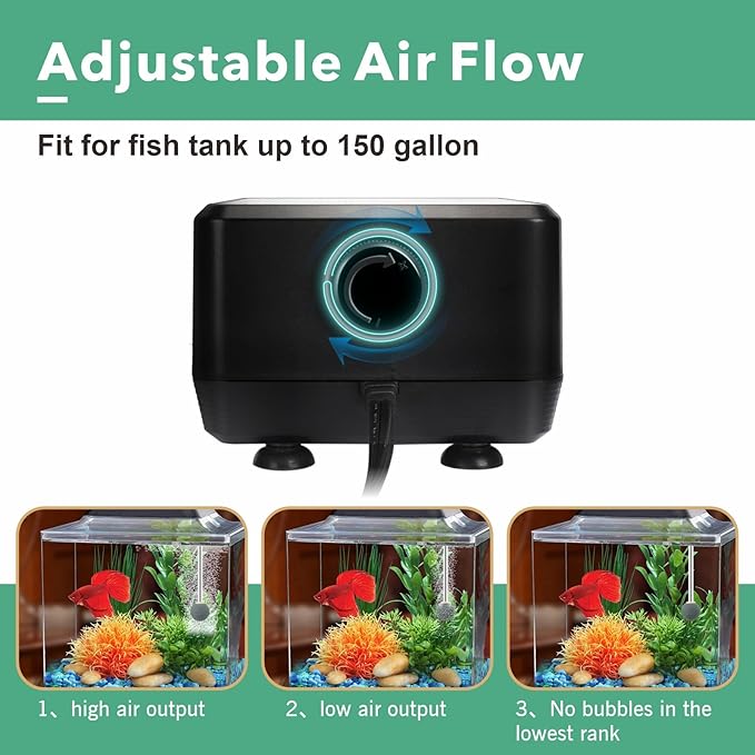 - Adjustable Flow Control: build-in control knob, this fish air pump allows you to adjust the air flow to optimize the performance of your air pump drive equipment, appliance or ornaments (Please note: Air tubing not included)