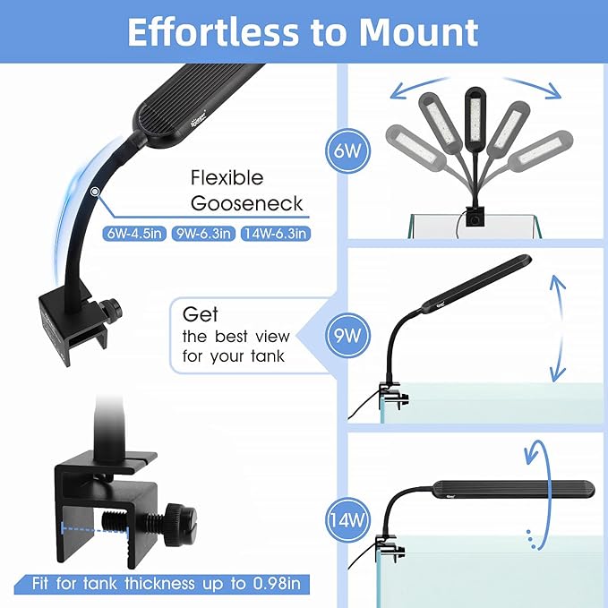 - Flexible Gooseneck & Simple Clip: This fish tank clip lamp has a 6.3-inch length of 360° flexible gooseneck tube you can easily adjust the light angle and direction. The upgraded mental clip bracket with a screw for tightening, which is securely for framed or frameless aquarium thickness up to 0.98 inches