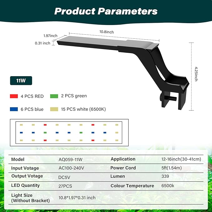 - Essential Clip On Aquarium Light: Light is made of aluminum alloy material and high brightness 5730 lamp beads; bracket material is sturdy ABS; The lamp panel is filled with glue to increase the waterproofing of the lamp; best partner for fish tanks