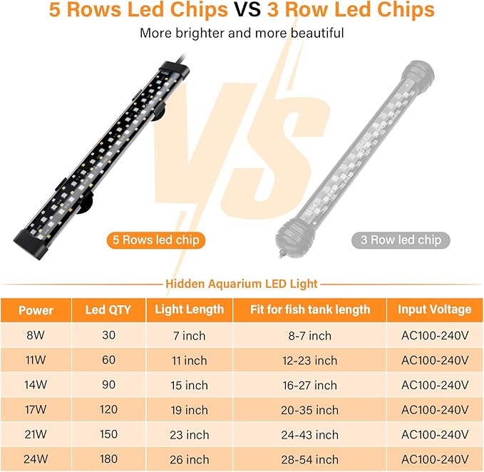 - ★[5 columns of Led Chips, High-quality Led]: Compared with other submersible led lights, our lights have up to 5 rows of LED chips, which are brighter and more beautiful. Our fish tank lights use high-quality 2835 + 5050 model lamp beads with a long service life of at least 50,000 hours. Tish ultra bright full-spectrum RGB LEDs can present the vivid colors of aquatic plants and fish, making your fish tank a colorful landscape