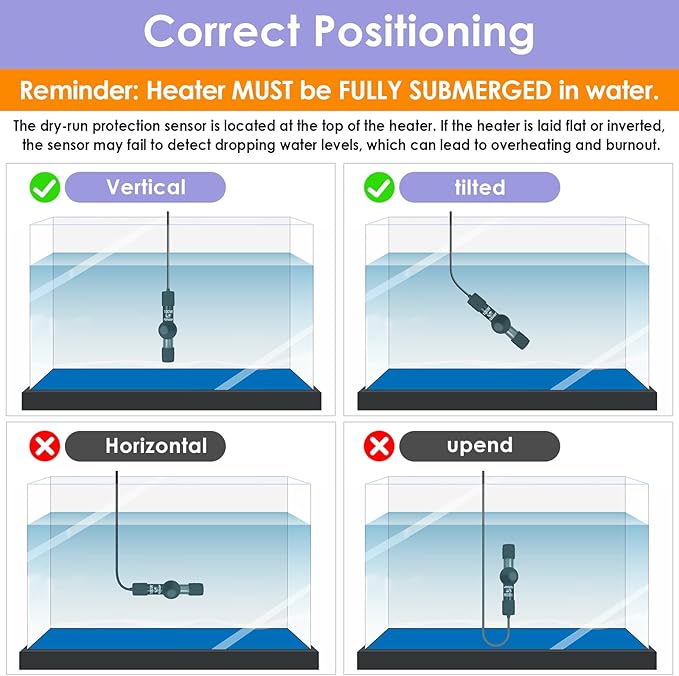 - SAFETY FIRST - Overheating and dry run protection got you covered. If the water dips below the minimum required level, the heater switches off (DRY RUN PROTECTION). It also powers down if the water temperature surpasses 97F (OVERHEATING PROTECTION), so you don't have to worry about inadvertently "cooking fish"!