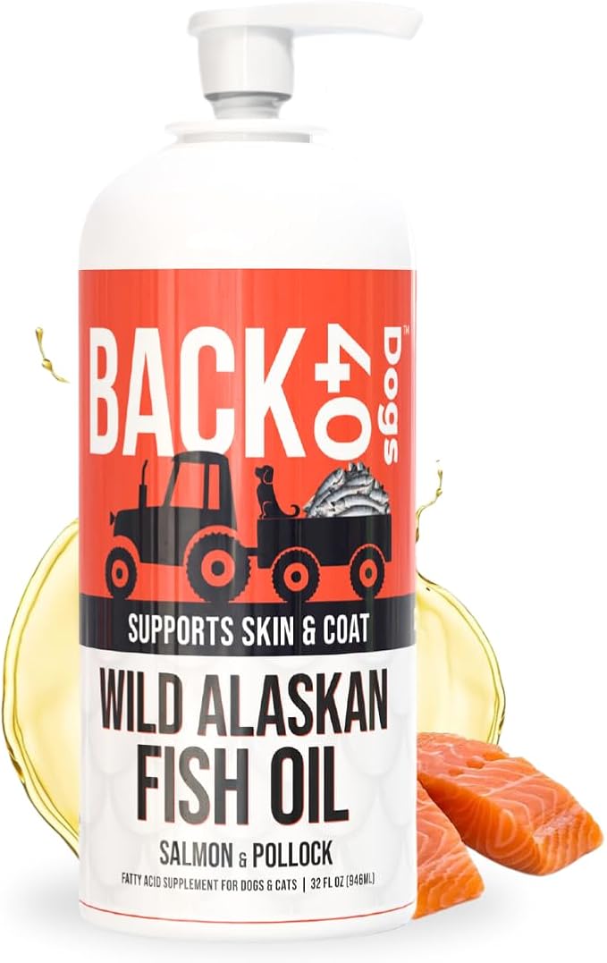 BACK 40 Dogs Wild Alaskan Fish Oil for Dogs, Skin and Coat Supplement for Dogs & Cats, Omega-3-Rich Salmon and Pollock Oil, EPA & DHA Dog Salmon Oil for Brain, Heart, and Joints 32 fl oz
