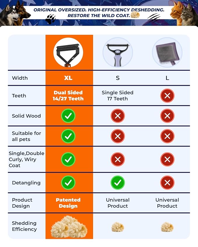 Extra Large 2-Sided Undercoat Rake for Dogs & Cats, Dog Brush for Shedding Remove Mats, Dematting Comb, Safe&Gentle Grooming Brush for German Shepherds Medium to Long-Haired Pets, Wooden Handle(Black)