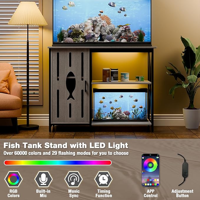 - 【Smart LED Lights】The aquarium stand is equipped with a stick-on LED strip underneath the board,you can choose whether or not to install it depending on your needs. The RGB LED lights feature over 60000 colors,you can adjust the color of the lights through a mobile App or control buttons.It also with a music function and a built-in mic, the color of the LED light will change with the rhythm of the sound and music.