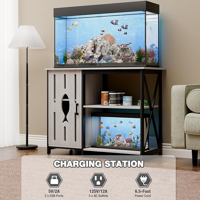- 【Power Outlets and USB Charging Ports】Our fish tank stand have built-in 2 USB ports,and 3 power outlets,with switches,allowing you to easily power your equipment and charge devices.There is a 7-centimeter diameter circular hole on the back of the storage cabinet for easy wire management.