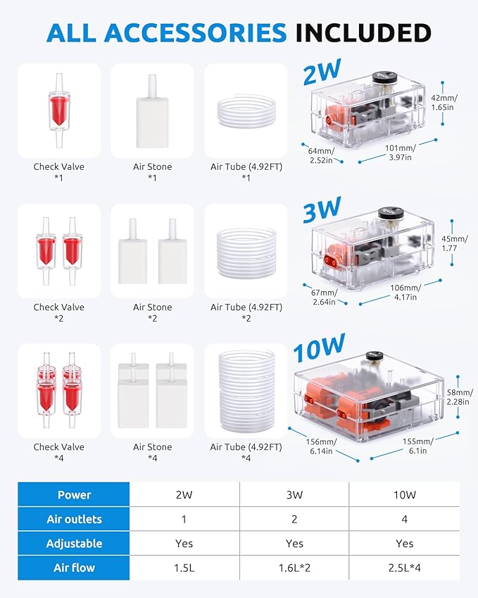 - Complete Accessories: 1x Aquarium Air pump (6FT power cord); 4x 4.92FT Air tubes; 4x Air Stone; 4x Check valve; 1x User manual