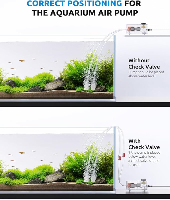 - Complete Accessories: 1x Aquarium Air pump (6FT power cord); 2x 4.92FT Air tubes; 2x Air Stone; 2x Check valve; 1x User manual