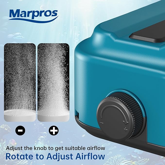 - Adjustable Air Pump: There is a knob setting on the pump top to adjust air flow volume easily at its range setting maxium to 255GPH. You can adjust the air volume according to the size of your tank to ensure proper oxygen support for your pets.