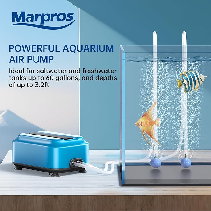- Aquarium Air Pump: Marpros fish tank air pump 5W comes with a sleek housing in matt blue with black accent finsh, stainless steel double outlet, vibration-reducing silicon pads. The pump exhausts air volume 64GPH max. for up to 100 gallon fish tank, size is 6.3L*3.94W*3.03H inch. Different air stones or aerator bubble diffuser can be connected with. It is a ideal choice for your fish tank or aquariums.
