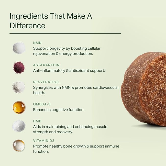 - Active Ingredients : HMB, Omega-3, NMN, Resveratrol, Astaxanthin, Vitamin D3