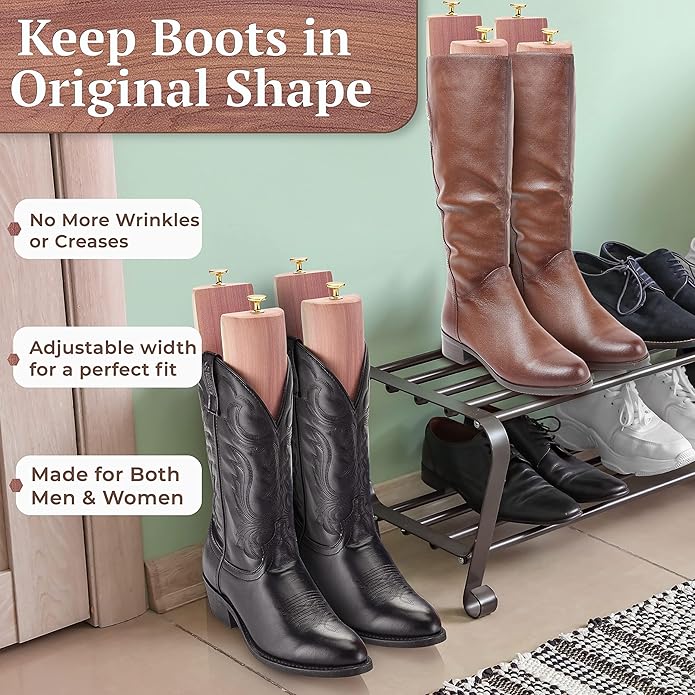 - American Grown Premium Cedar - Our top quality premium boot shaper inserts are made from aromatic cedar that absorbs moisture and preserves the shaft of your boots. They can also be widened to act as a boot calf stretcher by rotating.