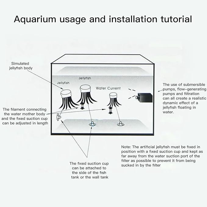 - 【Easy to Install】 The glowing jellyfish for fish tank comes with a suction cup and a thin wire. You only need to wrap the thin wire around the gap of the suction cup, and then fix it on the fish tank to make the jellyfish float. The height of the jellyfish can be adjusted at will, and the suction cup has a strong adsorption force, so there is no need to worry about falling off.