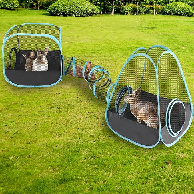 - Large space for small animals: The tunnel length is 50.4'', the height inside the tent is 24.5'', and the cube side length is 18.5''; Each module can be freely connected, which not only allows lively and active pets to shuttle freely, but also provides the of security for them; This pet playpen pecially suitable for small pets such as rabbits, chinchillas, ferrets, guinea pigs, and kittens, allowing them to play freely without feeling cramped
