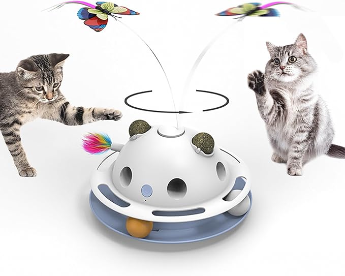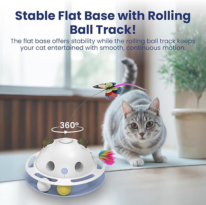- 4-in-1 Interactive Cat Fun – Combines a fluttering butterfly, feather shooter, catnip ball holders, and rolling track balls for endless playtime variety.