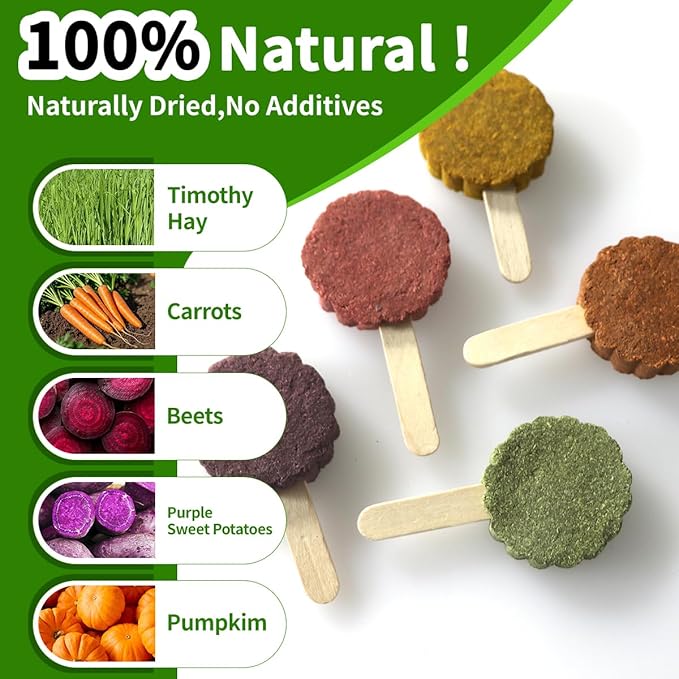- 【NUTRITIOUS & DIGESTIVE】Timothy hay lollipop are rich in high fiber, low protein, and multiple vitamins, which can help pets in cages promote gastrointestinal peristalsis, efficiently aid digestion, relieve tension, improve appetite, and ensure the healthy growth, entertainment, and exercise of pets.
