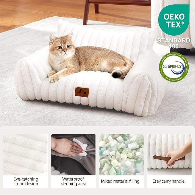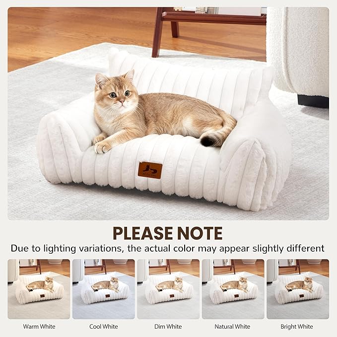 Warmrest Cat Couch for Pets, Cute Cat Bed with Cozy Soft Faux Rabbit Fur for Kitten, Fuzzy Cats Sofa for Indoor Cats, Supportive Pet Sofa with Removable Washable Cover, Cream, 24"