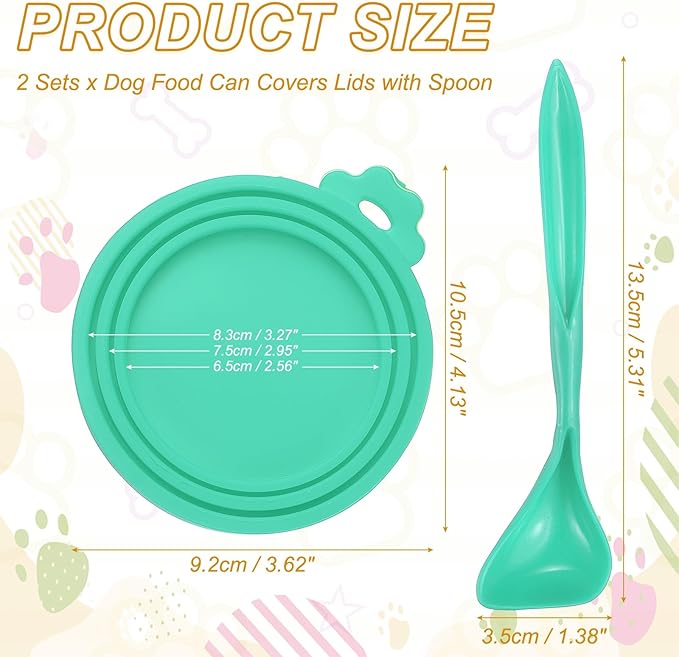 - Product Specifications: Material: Silicone; Color: Cyan; Inner Diameter: 6.5 cm / 2.56 Inch; 7.5 cm / 2.95 Inch; 8.3 cm / 3.27 Inch; Spoon Size: 13.5 x 3.5 cm / 5.31 x 1.38 Inch (LxW); Total Size: 10.5 x 9.2 cm / 4.13 x 3.62 Inch (LxW); Packing List: 2 Sets x Dog Food Can Covers Lids with Spoon