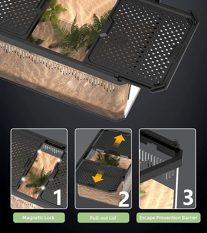 - 【Breathable & Secure Design】:This reptile enclosure features multiple ventilation holes on the top and sides, ensuring the safety of small pets while improving air circulation and maintaining stable humidity.
