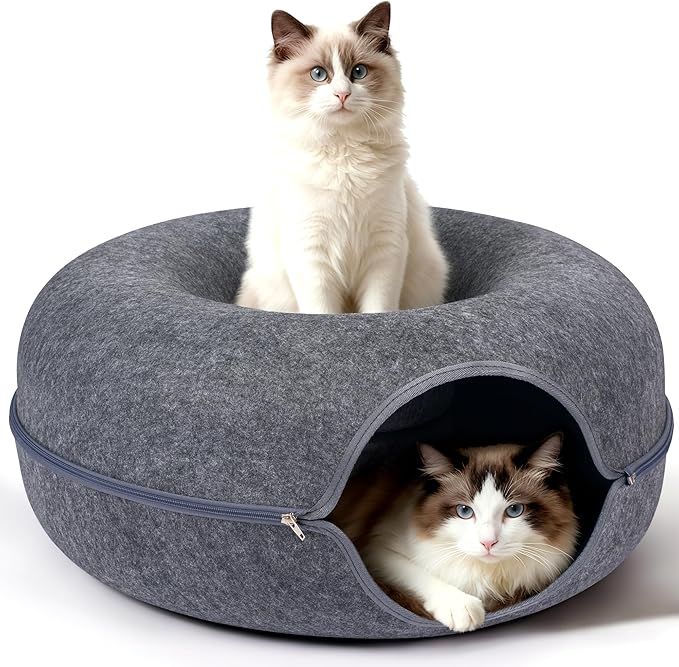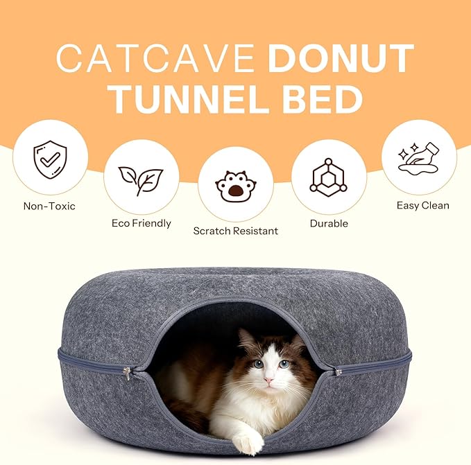 - 【2-in-1 Design: Sleep & Play】 This innovative donut-shaped cat cave is the ultimate playground and sanctuary for your furry friends. The spacious tunnel allows cats to run, hide, and chase, while the cozy recessed top provides a perfect nest for a peaceful nap. It’s the ideal solution for cats who love to curl up and hide.
